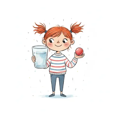 Niedliche, kindgerecht illustrierte Szene mit einem Kind oder einer Person als Hauptfigur, vor rein weißem Hintergrund, im frech-nordischen Aquarell-Skizzenstil. Klare, leicht wackelige Tuschekonturen, sichtbare Pinsel- und Strichtextur, dezente Schraffuren, weiche handgemalte Farbflächen in gedeckten Farben. Einfache, runde Formen. Keine harten Schatten, sondern sanfte, transparente Aquarellschichten. Leicht raue, handgezeichnete Linien statt glatter Vektorkanten. Subtile, vereinzelte Kritzelpunkte oder kleine Details im Hintergrund (wie Pünktchen oder feine Striche), aber keine echte Umgebung oder Landschaft. Die Figur ist mittig zentriert. Insgesamt charmant, humorvoll, warm und handgemacht wirkend. WICHTIG: Das Bild darf ABSOLUT KEINEN TEXT, KEINE BUCHSTABEN und KEINE ZAHLEN enthalten.