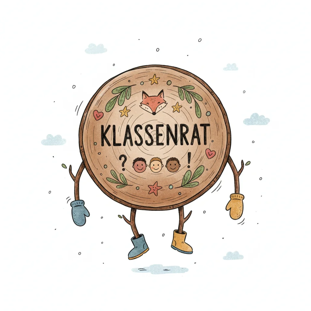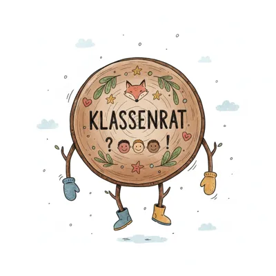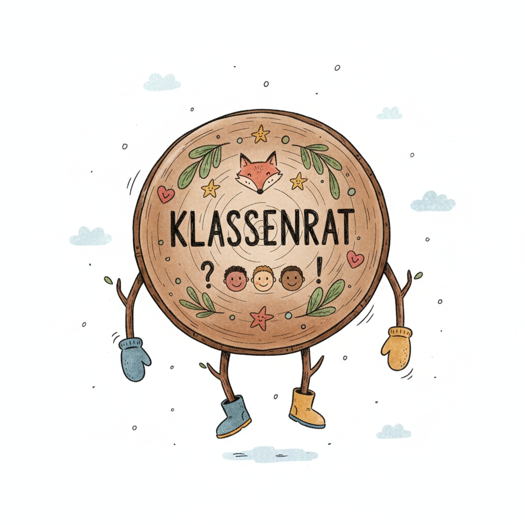 Freundliche Holzscheiben-Illustration mit 'KLASSENRAT', Fuchs, Kindergesichtern, Ästen, Fäustlingen und Stiefeln.