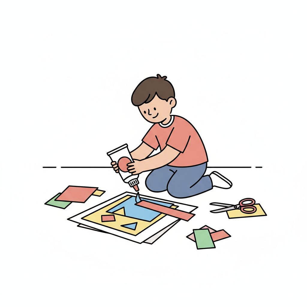 Ein Junge bastelt mit Papier und Kleber auf dem Boden.
