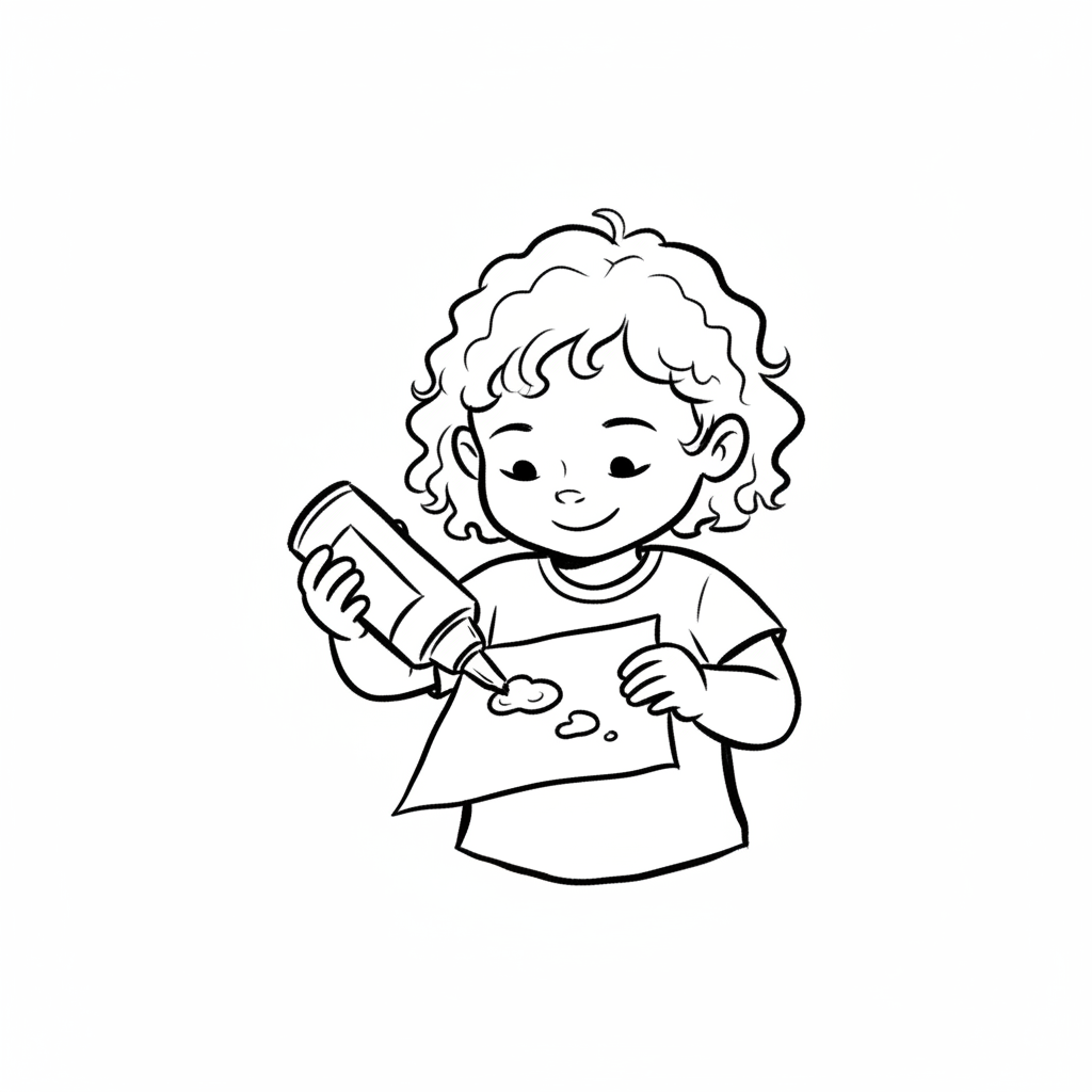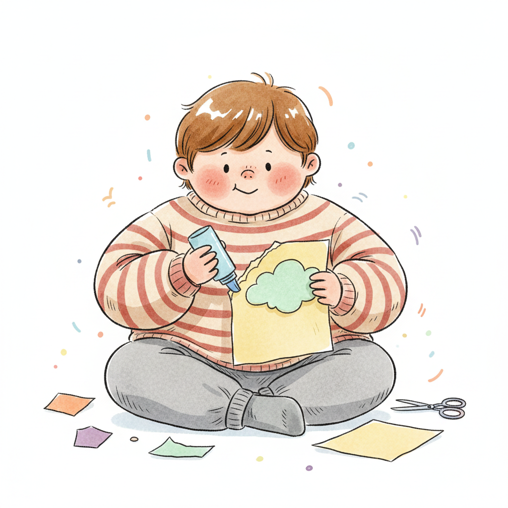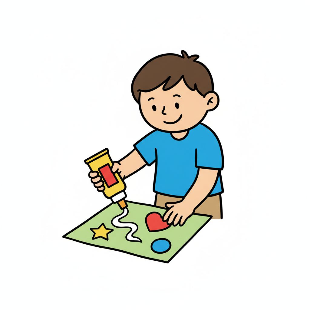 Ein Junge bastelt mit Papier und Kleber, um ein kreatives Projekt zu gestalten.
