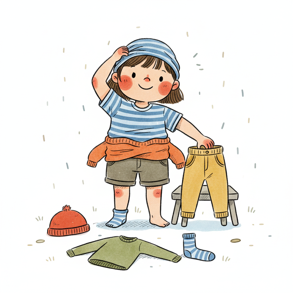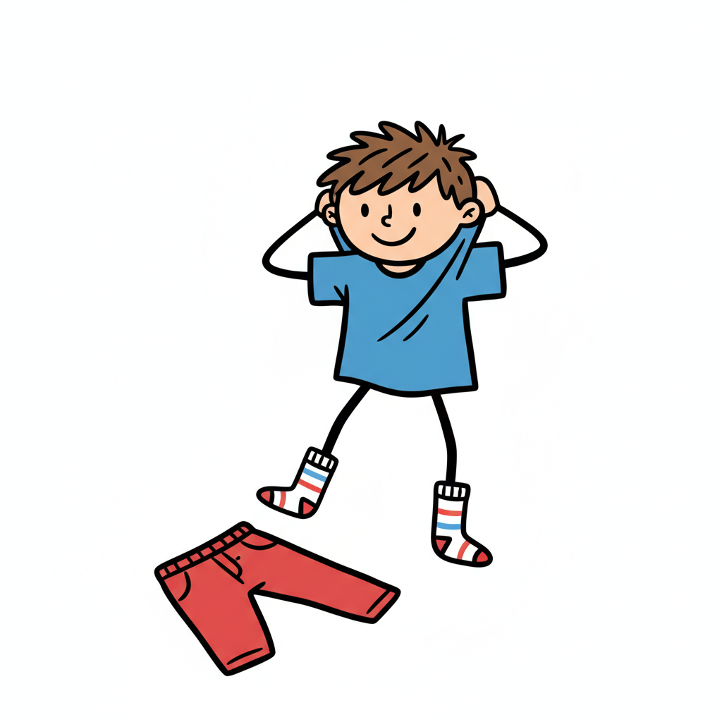 Ein Junge zieht sich ein T-Shirt über dem Kopf an, mit roten Shorts daneben.