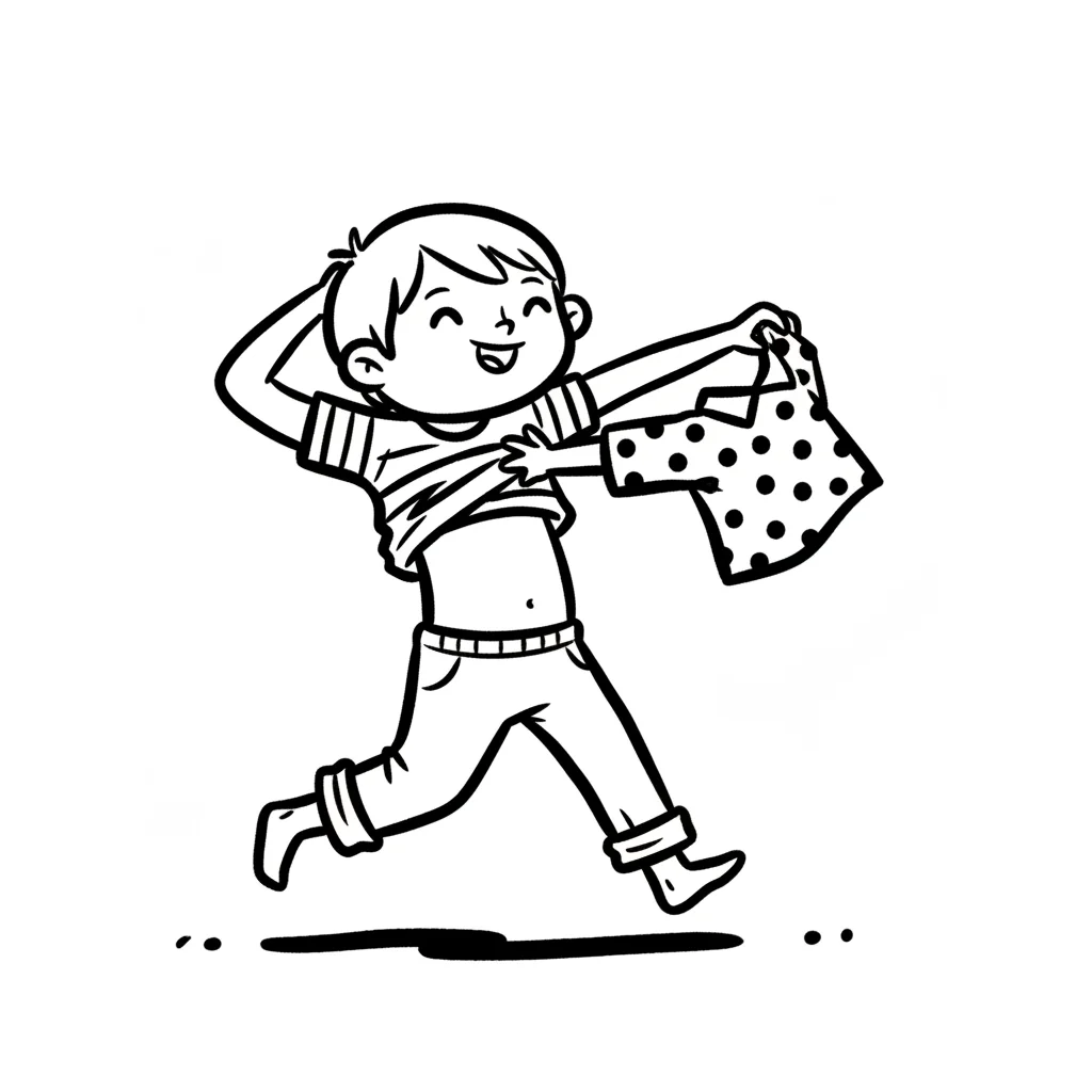 Ein Junge wählt Kleidung aus und zeigt einen fröhlichen Gesichtsausdruck.