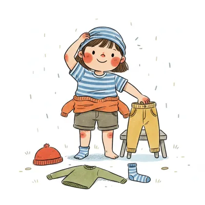 Niedliche, kindgerecht illustrierte Szene mit einem Kind oder einer Person als Hauptfigur, vor rein weißem Hintergrund, im frech-nordischen Aquarell-Skizzenstil. Klare, leicht wackelige Tuschekonturen, sichtbare Pinsel- und Strichtextur, dezente Schraffuren, weiche handgemalte Farbflächen in gedeckten Farben. Einfache, runde Formen. Keine harten Schatten, sondern sanfte, transparente Aquarellschichten. Leicht raue, handgezeichnete Linien statt glatter Vektorkanten. Subtile, vereinzelte Kritzelpunkte oder kleine Details im Hintergrund (wie Pünktchen oder feine Striche), aber keine echte Umgebung oder Landschaft. Die Figur ist mittig zentriert. Insgesamt charmant, humorvoll, warm und handgemacht wirkend. WICHTIG: Das Bild darf ABSOLUT KEINEN TEXT, KEINE BUCHSTABEN und KEINE ZAHLEN enthalten.