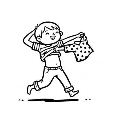 Ein Junge läuft fröhlich mit einem gepunkteten Shirt in der Hand.