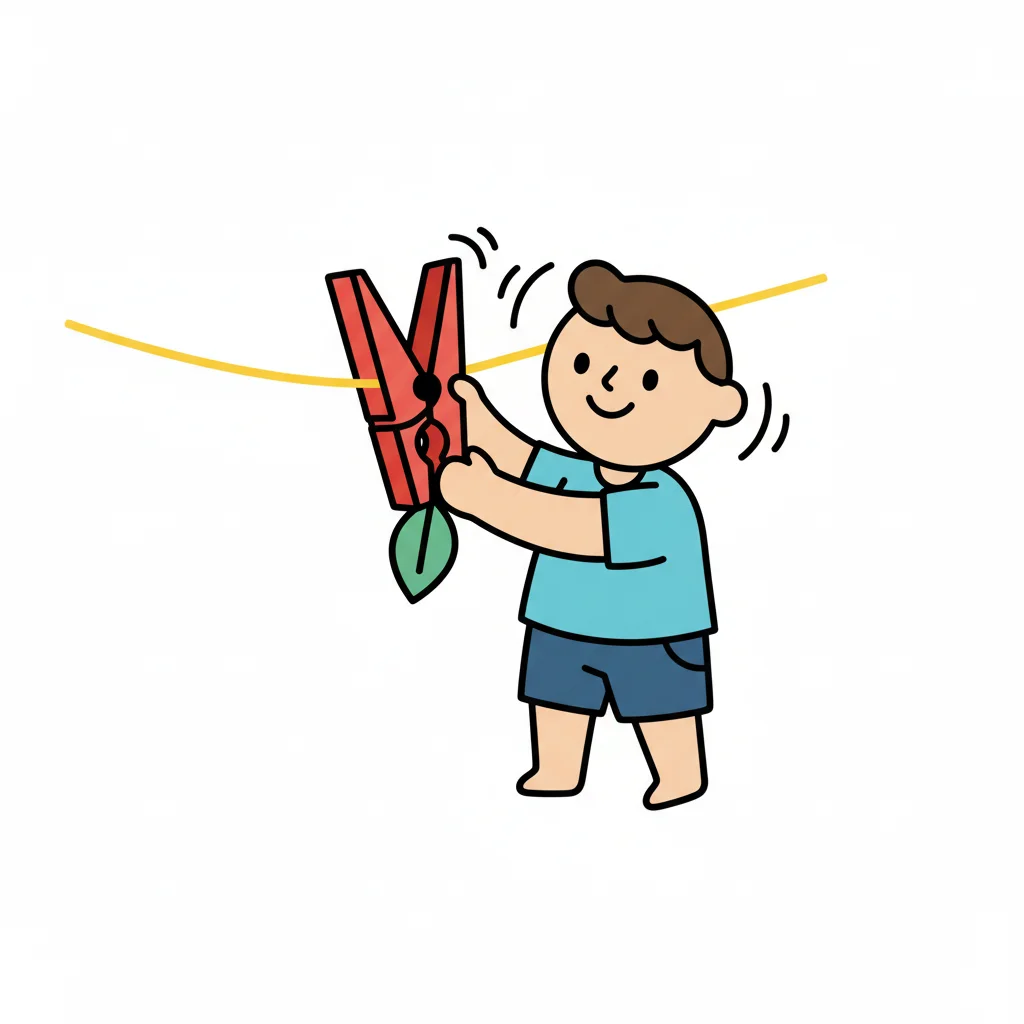 Ein Cartoon-Junge befestigt eine rote Wäscheklammer mit einem Blatt an einer gelben Leine.