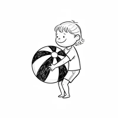 Schwarz-weiß-Skizze eines lächelnden Kindes, das einen großen gestreiften Ball hält.