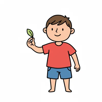Ein lächelnder Cartoon-Junge in rotem Shirt und blauen Shorts hält ein grünes Blatt.