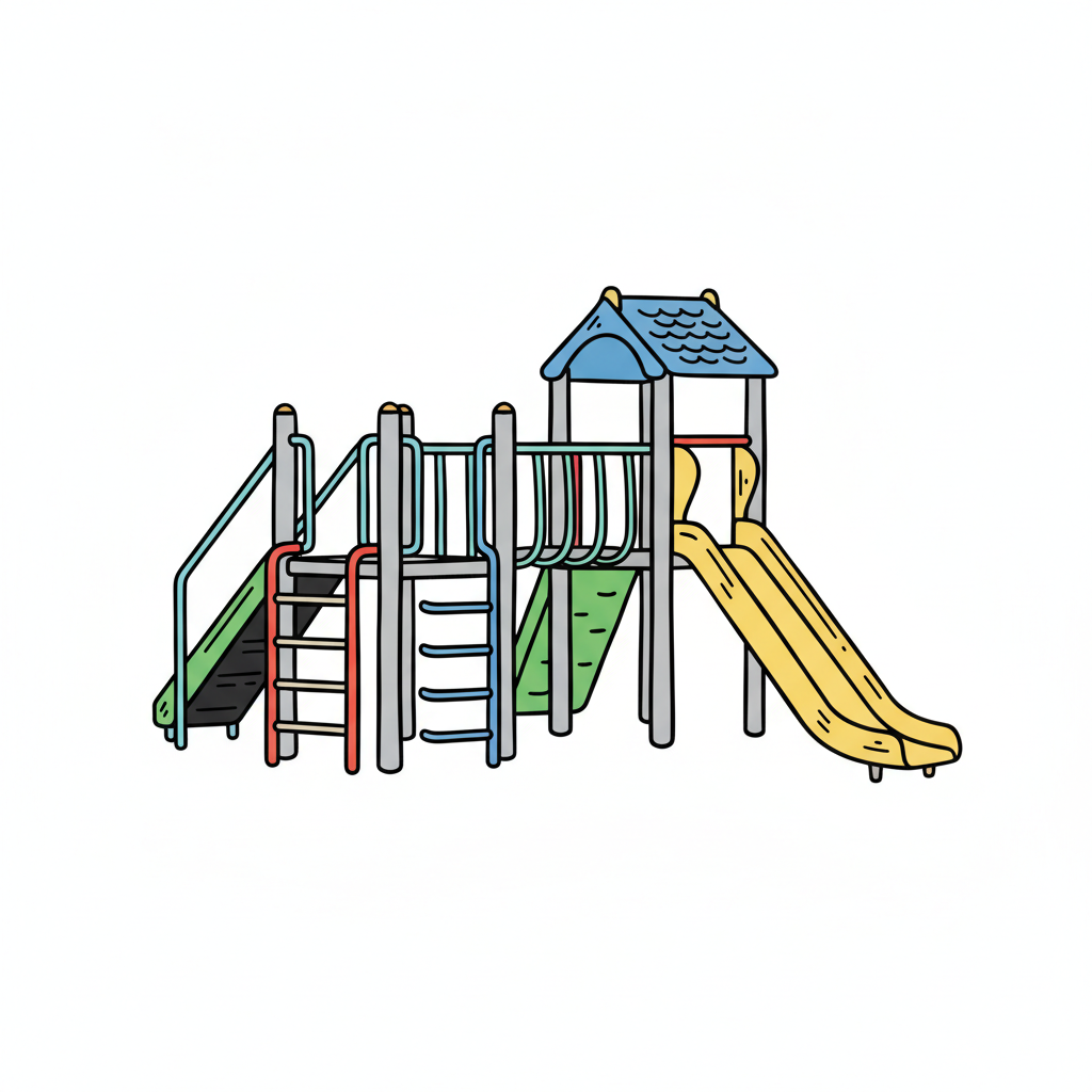 Bunte Illustration eines Spielplatzgeräts mit Rutschen und Leitern auf weißem Hintergrund.