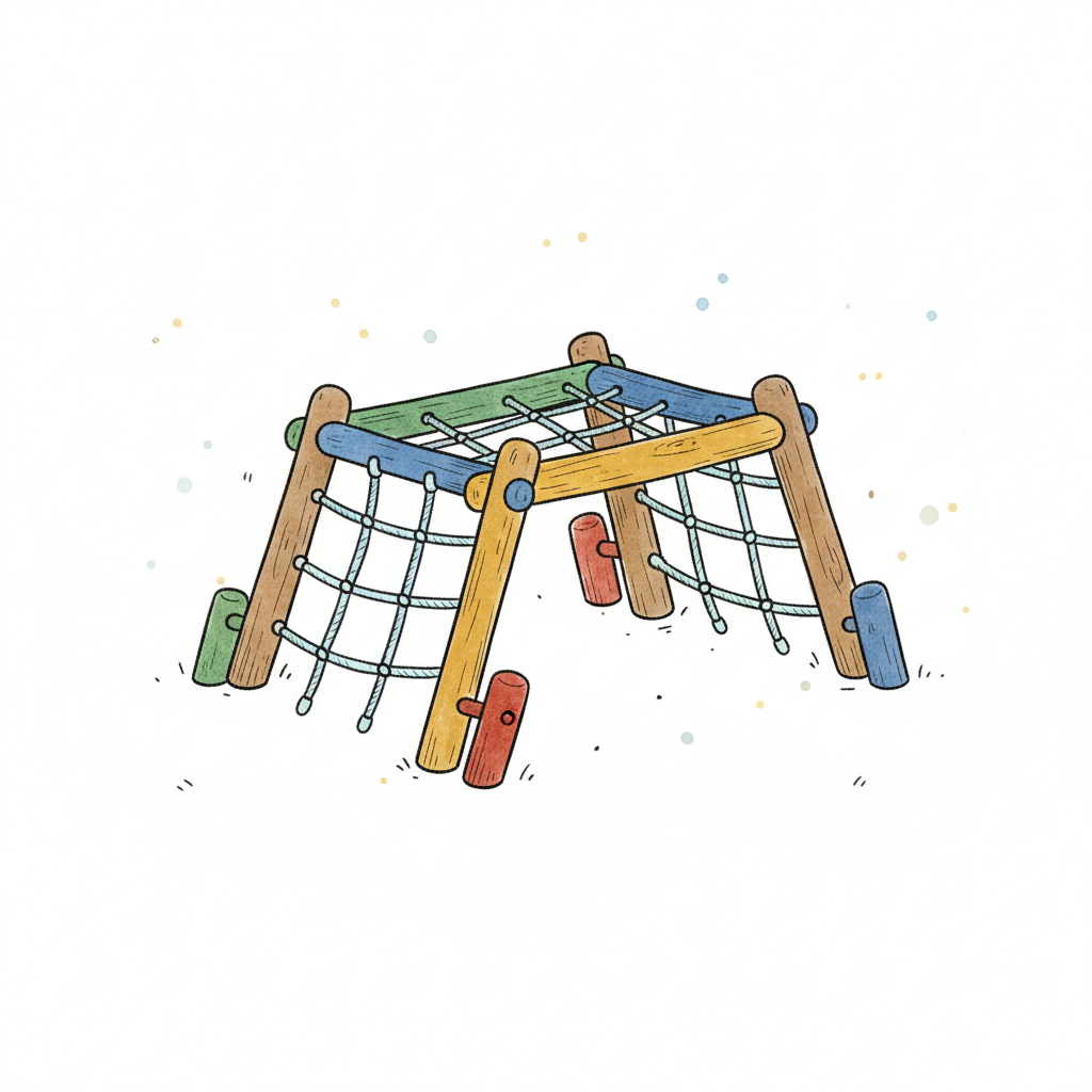 Bunte Illustration eines Klettergerüsts mit Netz und Fahne, schwebend auf weißem Grund.