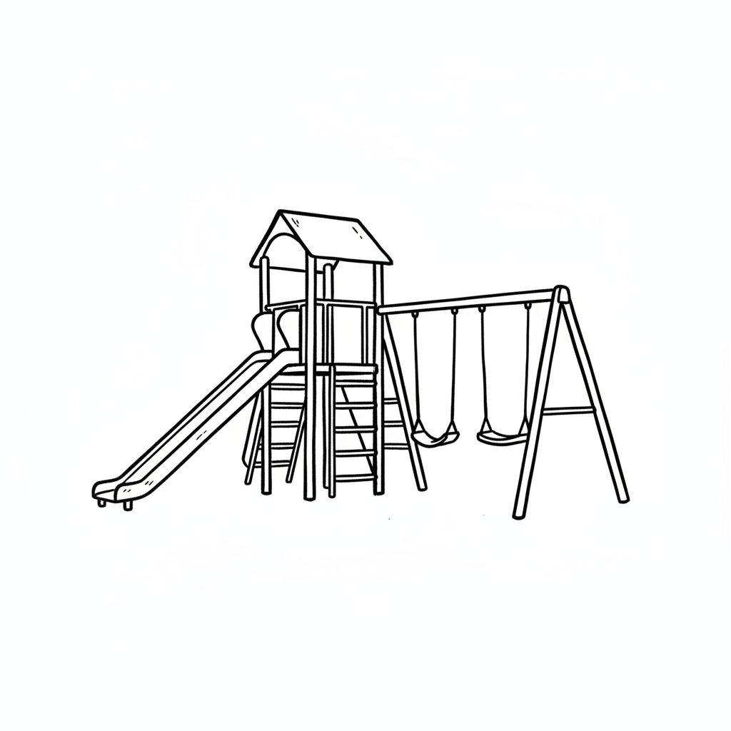 Schwarz-weiß-Strichzeichnung eines Spielplatzes mit Rutsche, Turm und Schaukeln.