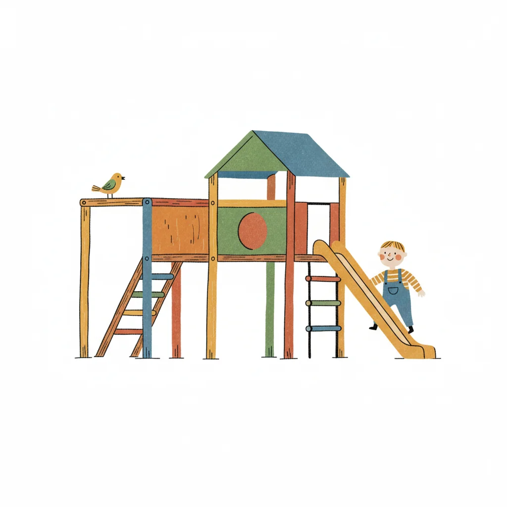 Illustration eines Kindes auf einer bunten Spielplatzrutsche mit einem Vogel auf dem Klettergerüst.