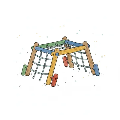 Buntes Klettergerüst aus Holz und Netz, ideal für Kinder zum Spielen.