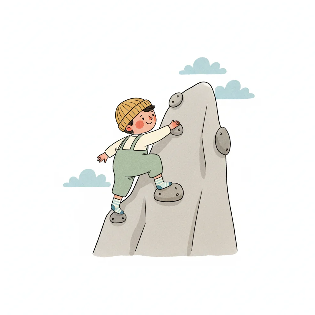 Ein Kind klettert fröhlich an einem Felsen mit Klettergriffen.