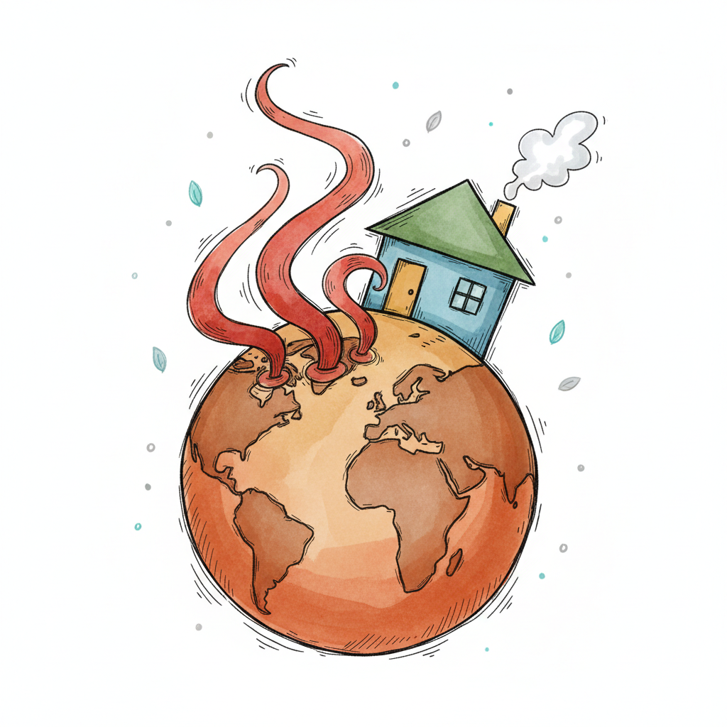 Cartoon-Erde mit roten Rauchschwaden und einem Haus, das den Klimawandel symbolisiert.