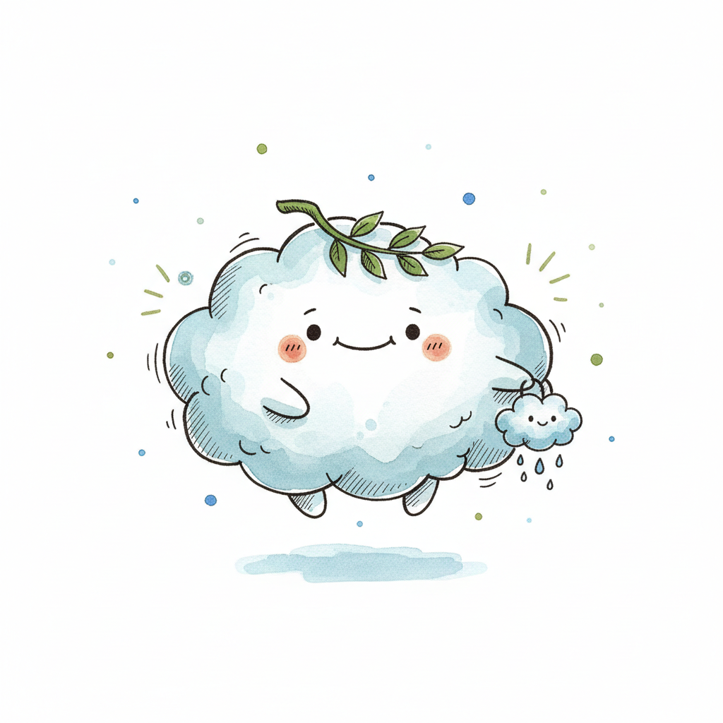 Niedliche Wolke mit Blätterkranz hält eine kleine, regnende Wolke in Aquarellstil.