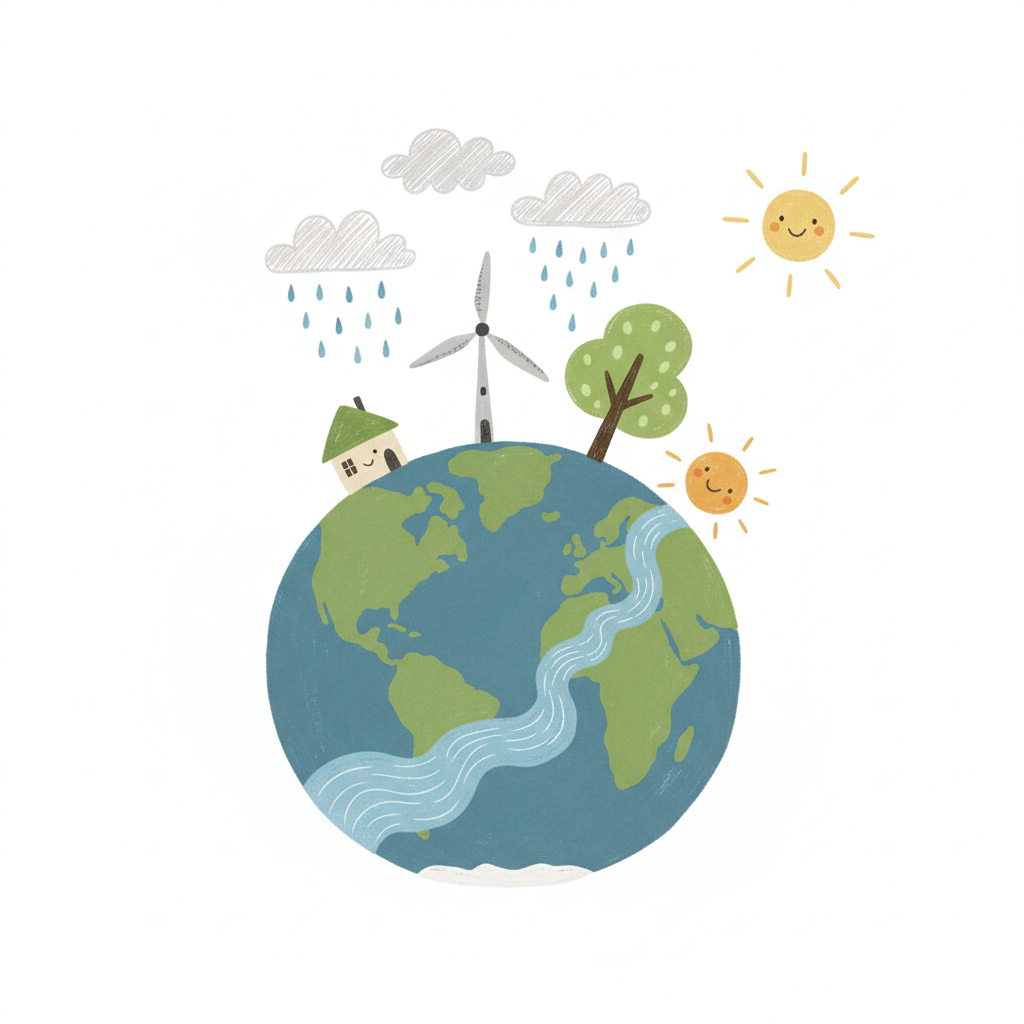 Niedliche Illustration der Erde mit Haus, Windrad, Baum, Regenwolken und lächelnden Sonnen.