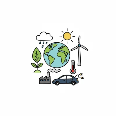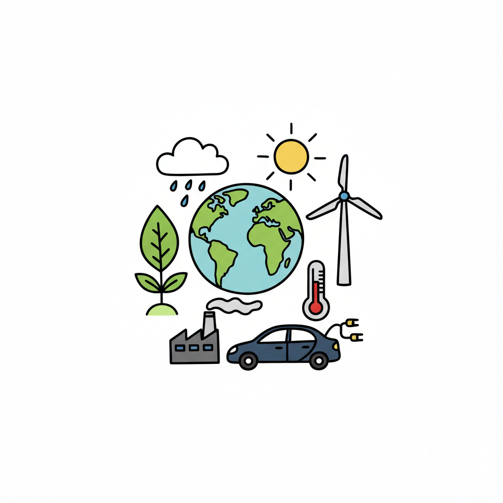 Illustration zu Umwelt, Klima und Nachhaltigkeit mit Erde, Sonne, Windrad, Fabrik, E-Auto.