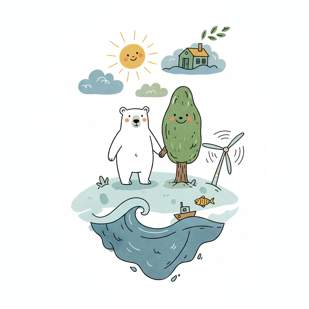Niedliche Illustration: Eisbär und Baum halten Händchen auf einer Insel mit Natur, Haus, Windrad und Meer.