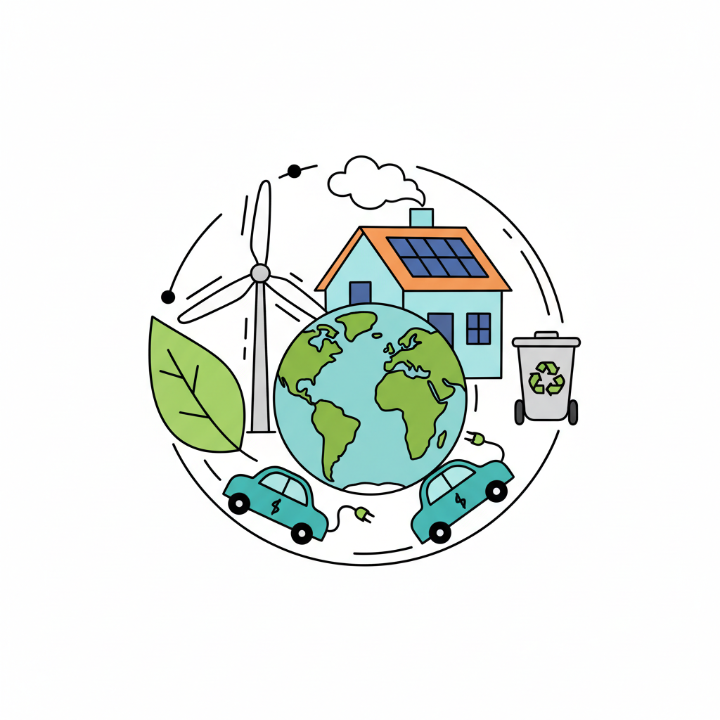 Illustration einer nachhaltigen Welt mit erneuerbaren Energien, E-Autos und Recycling.