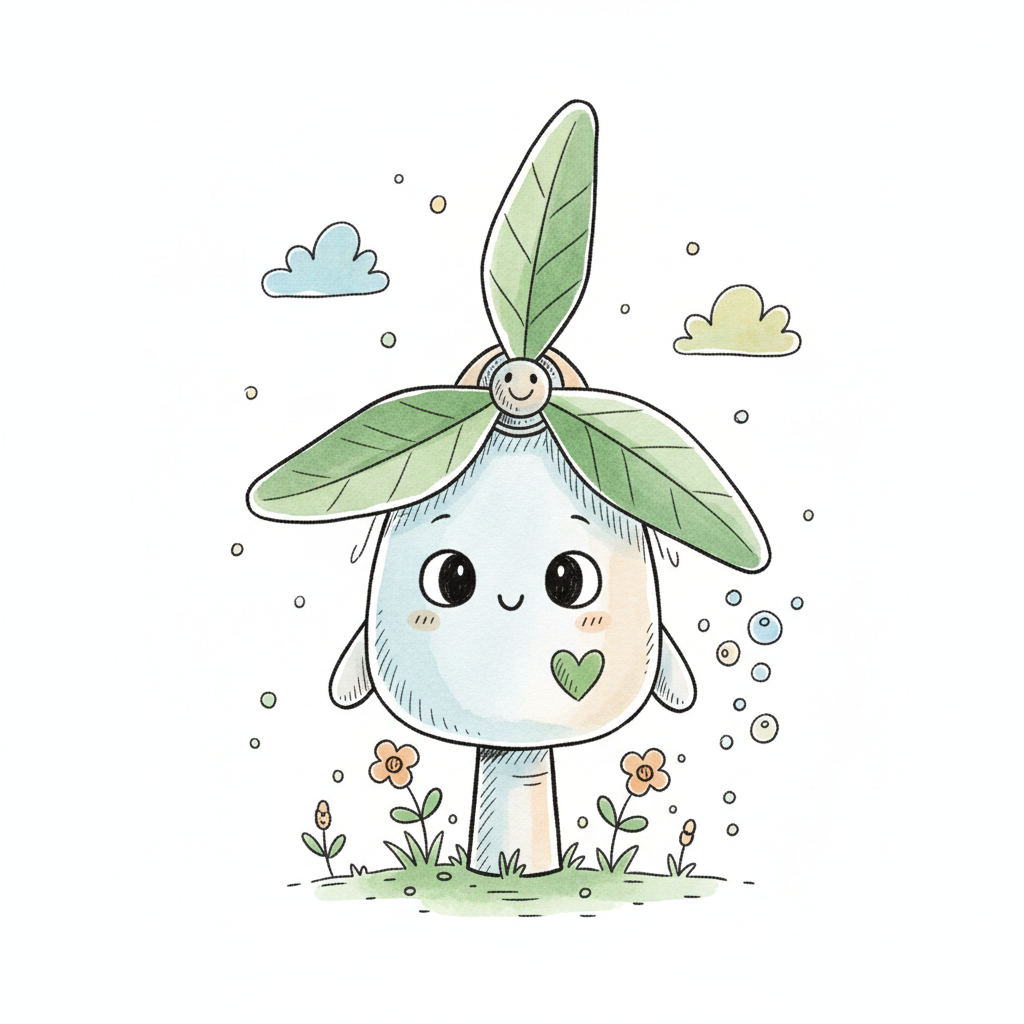 Niedliche Cartoon-Windkraftanlage mit Blättern als Rotorblättern, lächelnd in einer Blumenwiese.