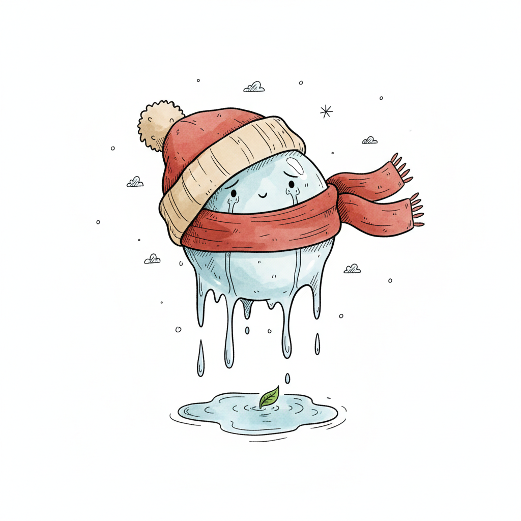 Cartoon-Eiswürfel mit Mütze und Schal schmilzt traurig, bildet Pfütze mit Blatt.