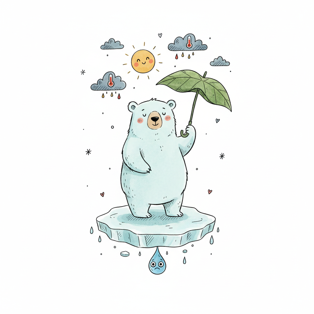 Eisbär auf schmelzender Eisscholle mit Schirm, umgeben von Sonne und Regen, symbolisiert Klimawandel.