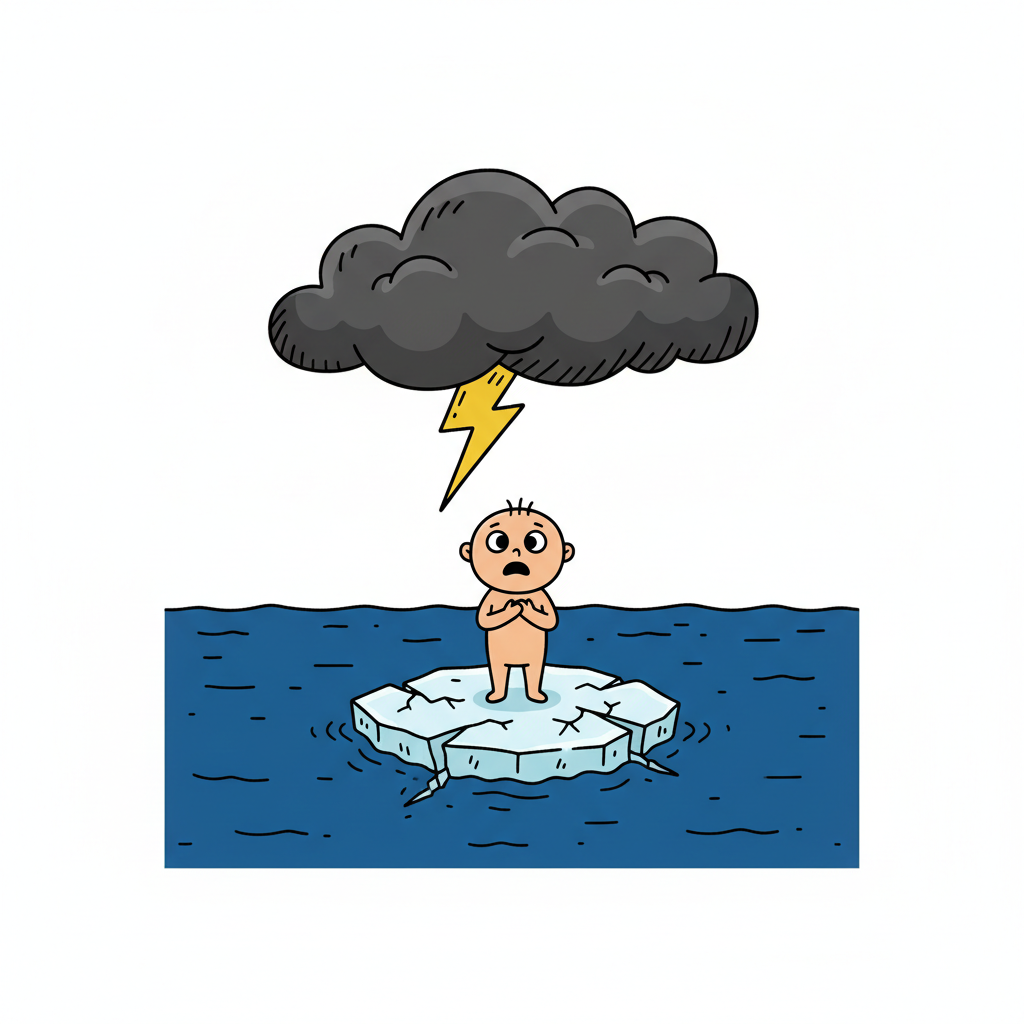 Ängstliche Person auf schmelzender Eisscholle unter Gewitterwolke mit Blitz.
