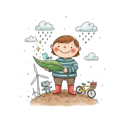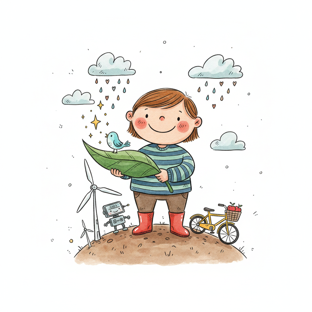 Lächelndes Kind hält Blatt, umgeben von Symbolen für Umweltschutz und Nachhaltigkeit.