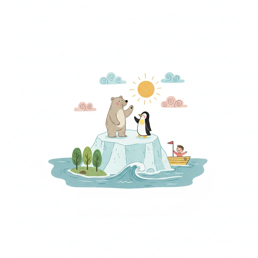 Ein Bär und ein Pinguin winken sich auf einer Eisscholle zu, umgeben von Wasser, Insel und Boot.