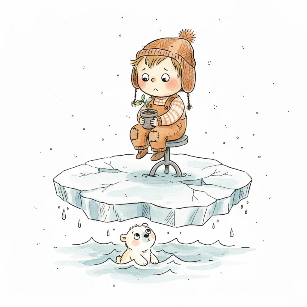 Trauriges Kind auf schmelzender Eisscholle hält Pflanze, Eisbär schwimmt darunter. Symbol für Klimawandel.