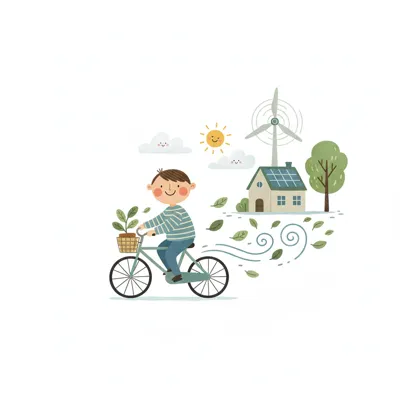 Junge fährt Fahrrad mit Pflanze vor Haus mit Solar/Windkraft. Symbolisiert Umweltschutz & Nachhaltigkeit.