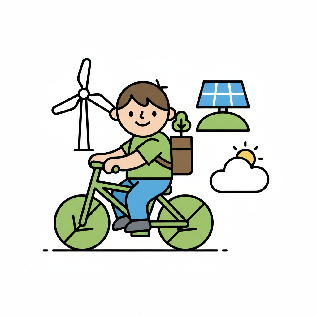 Cartoonfigur fährt Fahrrad mit Pflanze, umgeben von Windrad und Solarpanel, symbolisiert Umweltschutz.
