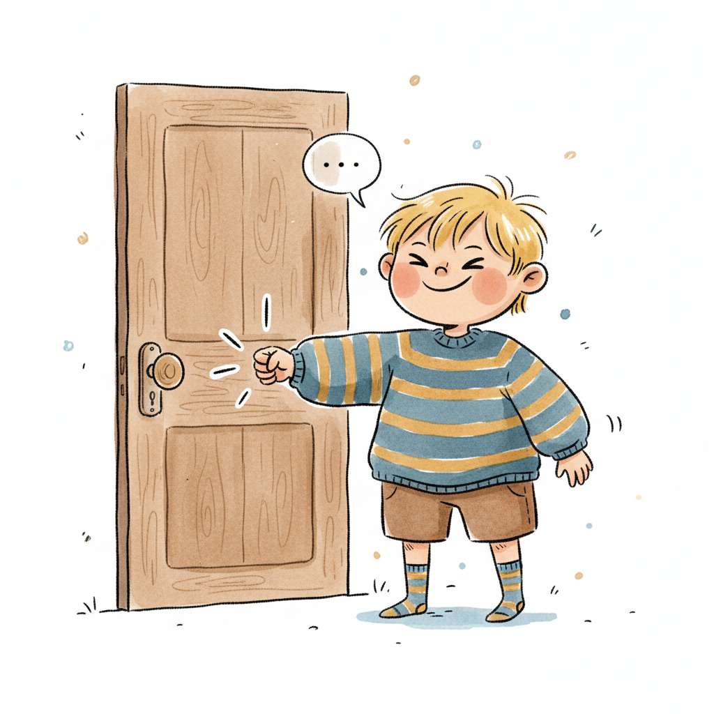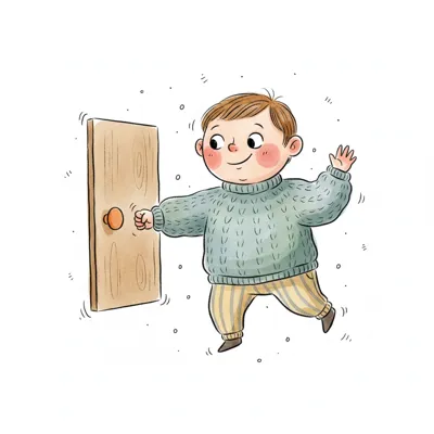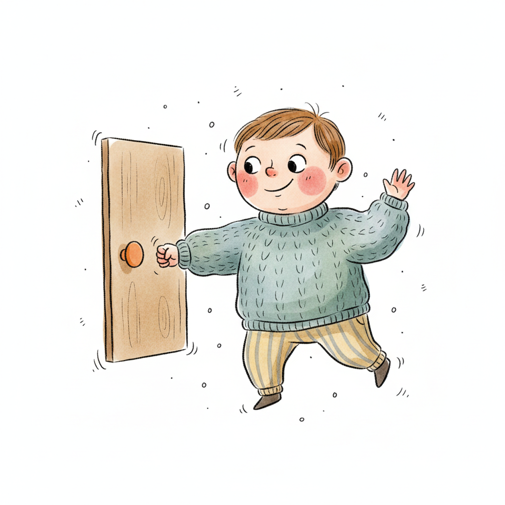 Ein fröhlicher Cartoon-Junge in blauem Pullover öffnet eine Holztür mit einem Lächeln.