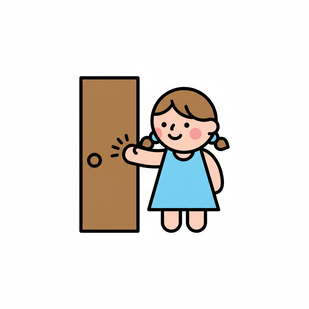 Niedliches Cartoon-Mädchen mit Zöpfen klopft lächelnd an eine braune Tür.