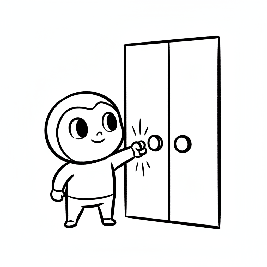 Cartoon-Äffchen klopft lächelnd an eine Tür. Schwarz-weiß-Illustration.