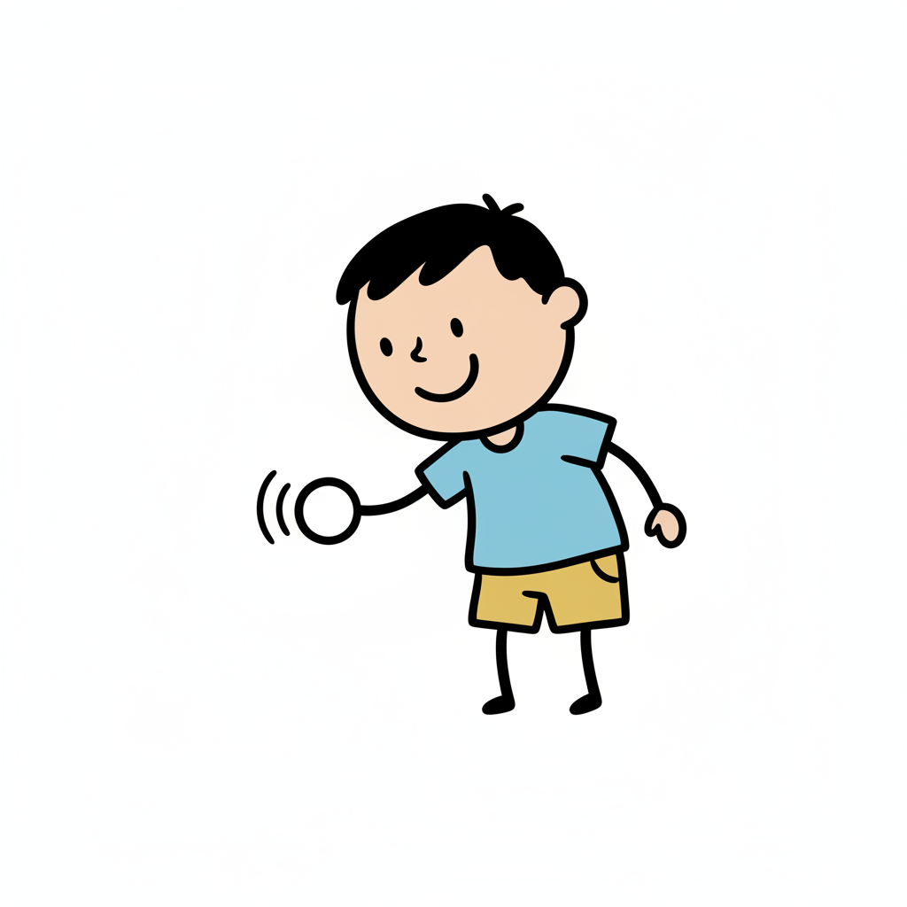 Ein lächelnder Cartoon-Junge in blauem Shirt und gelben Shorts hält einen springenden Ball.