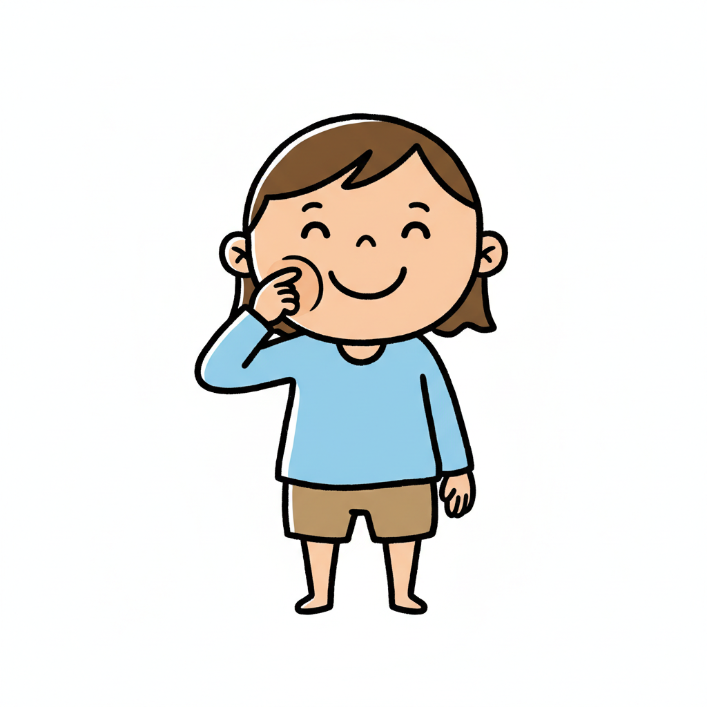 Glückliches Cartoon-Kind mit braunen Haaren, das sich an die Wange fasst und lächelt.
