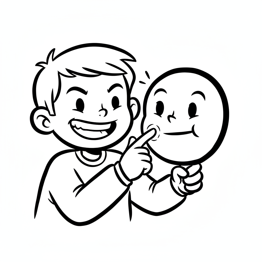 Ein lächelnder Cartoon-Junge zeigt auf die Wange eines Gesichts in einem Spiegel. Schwarz-Weiß-Stil.