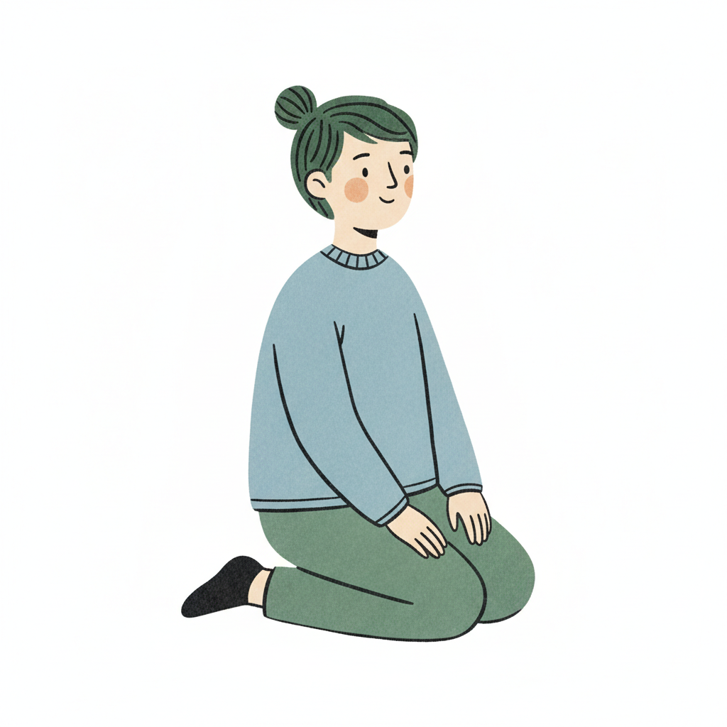 Eine Person kniet lächelnd, trägt einen Pullover und sitzt auf dem Boden.