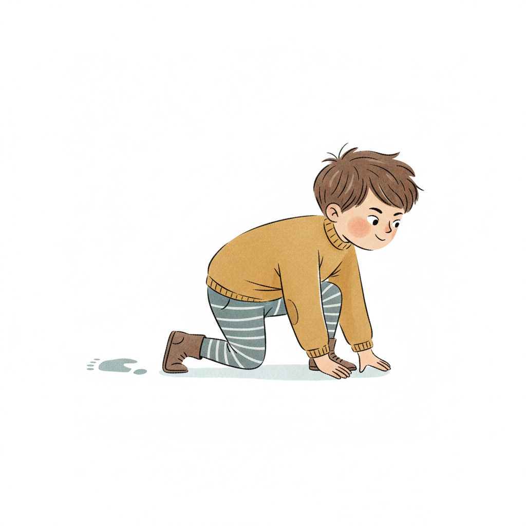 Handgezeichnete Kinderbuchillustration im modernen skandinavisch-nordischen Stil. Minimalistische, freundliche Figur mit einfachen Formen und leicht unregelmäßigen, handgezeichneten Linien. Ruhige, gedeckte Farbpalette, viel freie Fläche, reduzierte Details, sanfte Papier- oder Aquarellstruktur. Warme, ruhige, leicht humorvolle Stimmung, flächige Komposition ohne starke Perspektive, moderner nordischer Illustrationsstil, charmant und zeitlos.