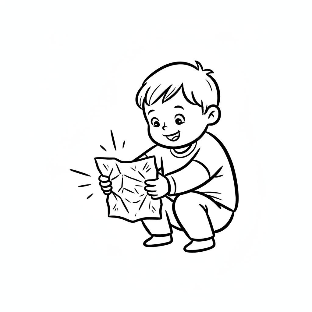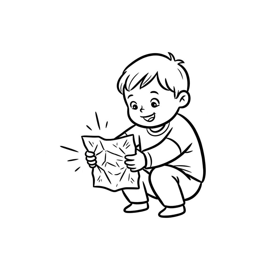 Ein lächelnder Cartoon-Junge hockt und hält eine leuchtende, zerknitterte Karte in den Händen.