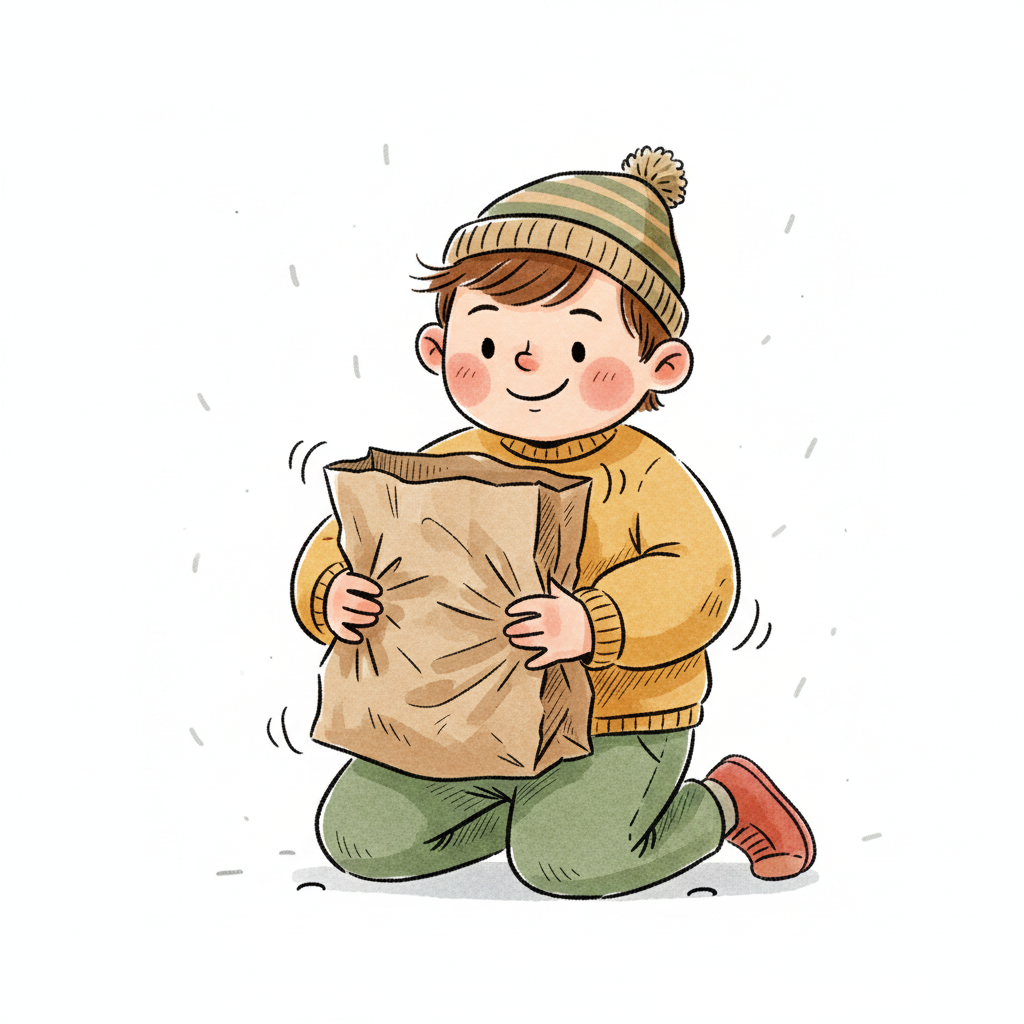 Ein lächelnder Cartoon-Junge mit Mütze kniet und hält eine braune Papiertüte.