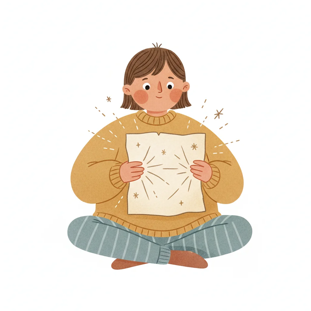 Ein Kind sitzt und hält ein magisch leuchtendes Blatt Papier, umgeben von Sternen.