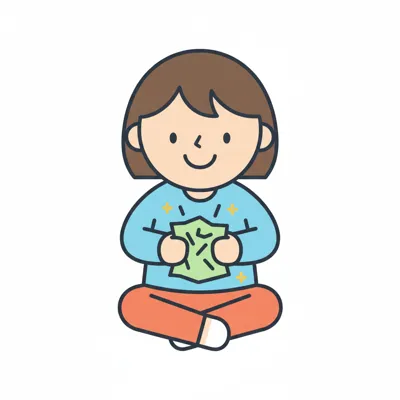 Fröhliches Cartoon-Kind sitzt und hält ein grünes, glitzerndes Papier.