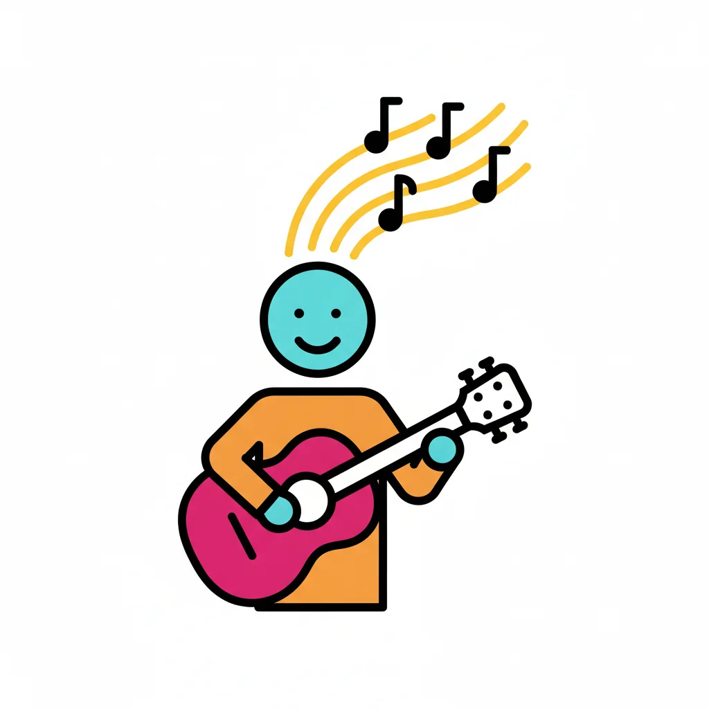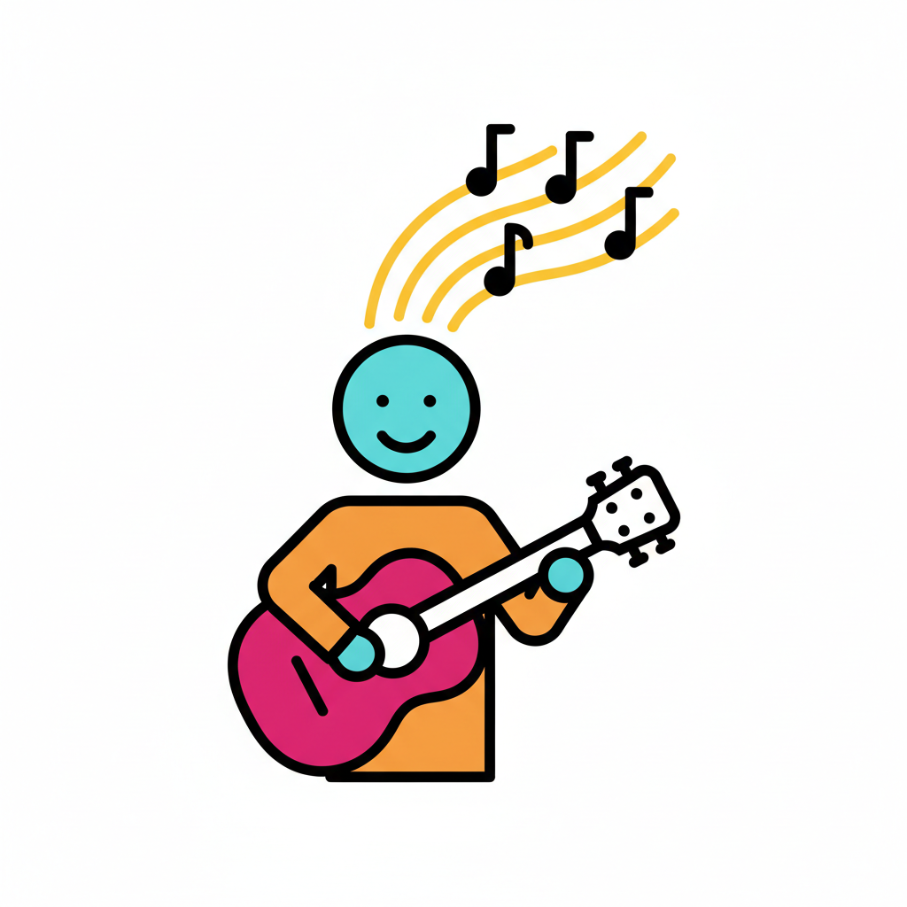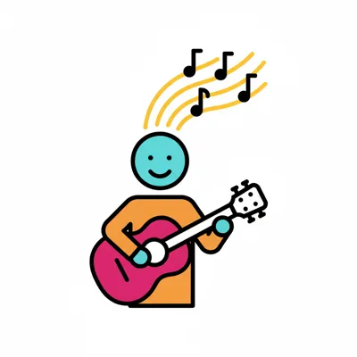 Ein blauer Charakter spielt eine pinke Gitarre, umgeben von Musiknoten.