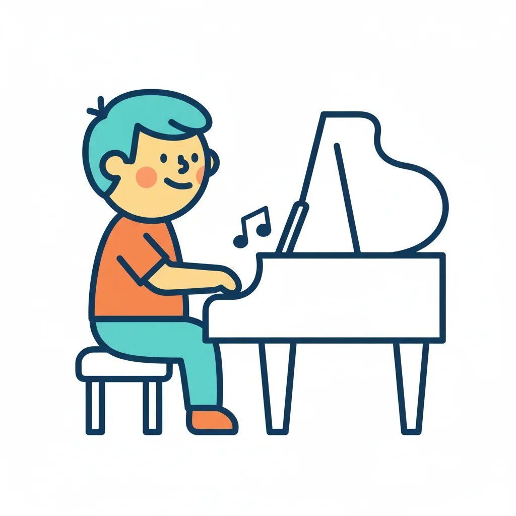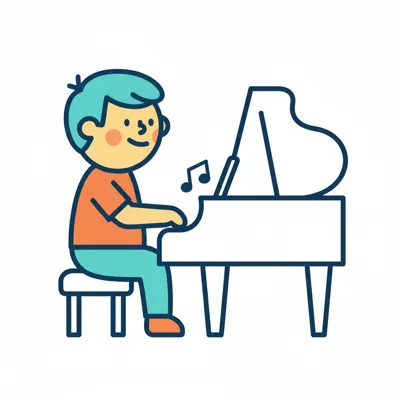 Ein Junge spielt fröhlich Klavier mit Musiknoten um ihn herum.