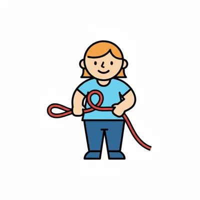 Ein Kind bindet einen roten Knoten mit einem Seil.