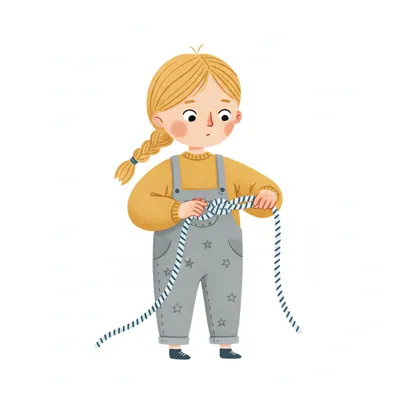 Handgezeichnete Kinderbuchillustration im modernen skandinavisch-nordischen Stil. Minimalistische, freundliche Figur mit einfachen Formen und leicht unregelmäßigen, handgezeichneten Linien. Ruhige, gedeckte Farbpalette, viel freie Fläche, reduzierte Details, sanfte Papier- oder Aquarellstruktur. Warme, ruhige, leicht humorvolle Stimmung, flächige Komposition ohne starke Perspektive, moderner nordischer Illustrationsstil, charmant und zeitlos.