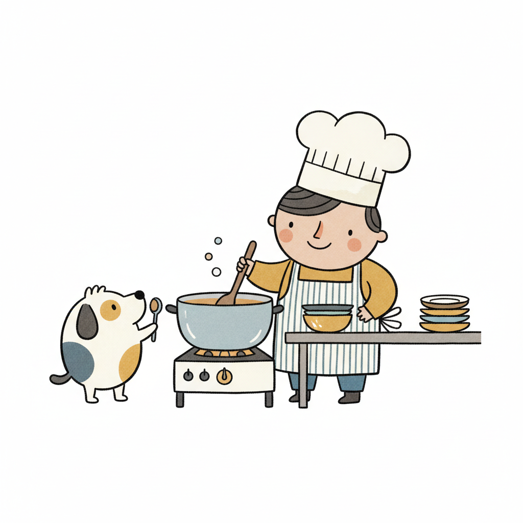 Ein Kochjunge rührt in einem Topf, während ein Hund mit Löffel zusieht.