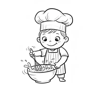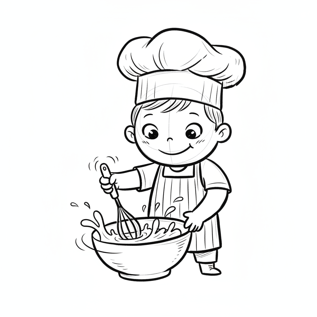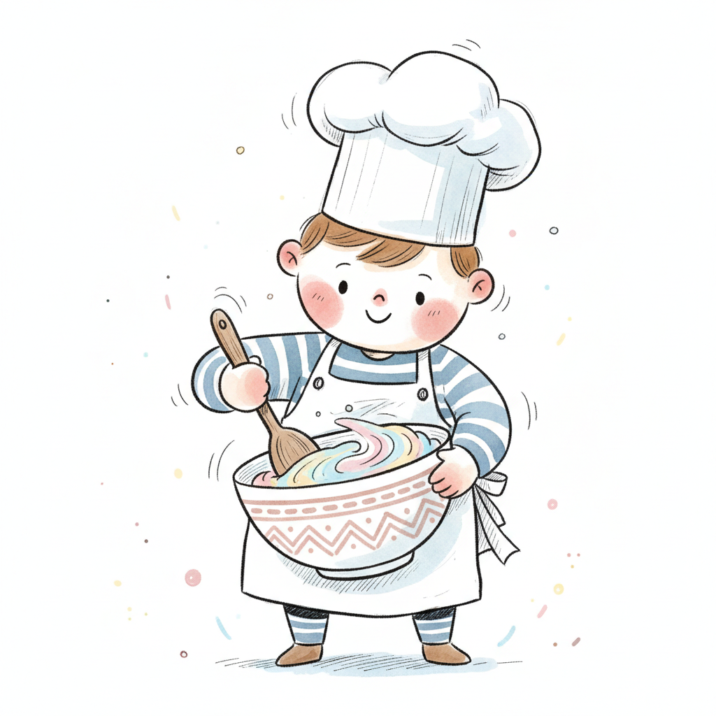 Fröhlicher Cartoon-Junge mit Kochmütze und Schürze rührt bunte Masse in einer Schüssel.